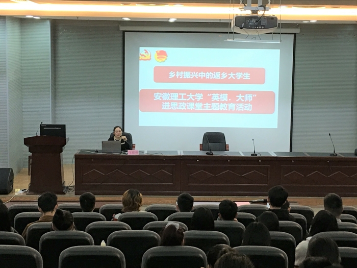 为切实加强大学生思想政治教育工作,大力弘扬道德模范和英模大师的高尚精神,激励广大师生崇尚先进、学习先进、争做先进,引领广大青年扎根基层干事创业,4月28日下午,学校举办“英模·大师进思政课堂”专题报告会。第十三届全国人大代表、第十三届全国青联副主席、中国青年五四奖章获得者、滁州市定远县吴圩镇西孔村党总支第一书记王萌萌应邀来我校作题为《乡村振兴中的返乡大学生》的先进事迹报告。报告会由校党委常委、副校长董雨主持,全校260余名师生聆听了报告。