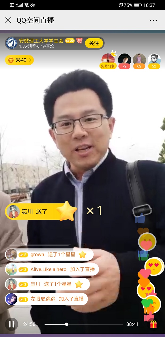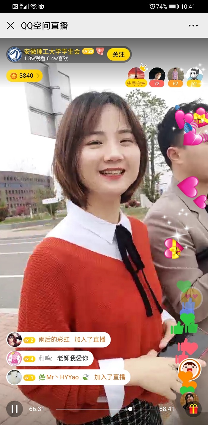“学校真的太美了,真的好想她”,“想念凌晨四点半的英语角,还有熟悉的同学们”,“此时,回学校是我最大的愿望”,“老师,我好想念食堂的早餐啊!”,“安理工也太美了吧,让我这个在江西上大学的安徽人好羡慕啊”......一时间,留言区成了网友们的表白区,大家隔空“比心”,许下美好心愿,期待返校相见。高中在读生、海内外毕业校友、学生家长、兄弟高校学子和师生们一起,大家在欣赏校园美景的同时,也在留言区积极互动交流、诉说心声。在近两个小时的直播过程中,共有1.5万人在线观看,收到点赞评论和转发6万人次。
