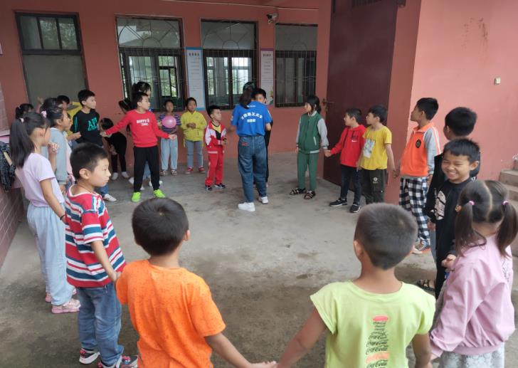志愿者们结合学院专业特色做了精心的教学设计,他们为高年级同学准备了自然灾害主题的科普教育,向他们介绍淮河治理、当地地理水文知识,普及地震逃生和泥石流防治等安全常识;为低年级同学介绍地球的生命演化过程,讲解地球生命的演变和生命的起源,激发他们学科学、爱科学兴趣。科普教育结束后,队员们准备了丰富多彩的户外素质拓展活动与学生们一起游戏,“萝卜蹲”、“背夹气球”等,志愿者与小学生们玩在一起,乐成一片。