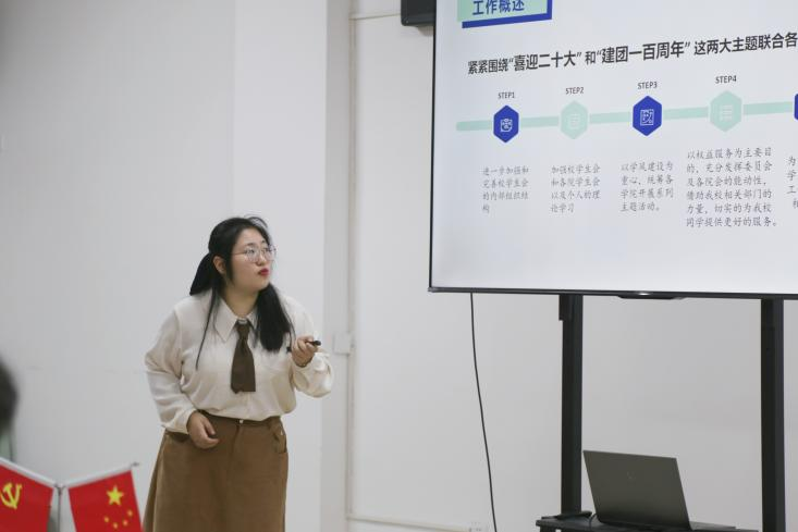 首先,由校学生会执行主席鲁韦妍代表学生会做2021-2022学年学生会工作总体汇报。鲁韦妍指出,校学生会始终把坚持好,维护好,发展好最广大同学的根本利益作为学生会履职的出发点和落脚点。在上一学年,学生会紧紧围绕活动组织、思想引领、学风建设和权益服务四个主题开展相关工作,全力发挥好同学与学校沟通的桥梁作用。同时鲁韦妍也指出了上学年学生会在组织改革上仍存在相关问题,并提出了相关解决方法和未来发展规划。