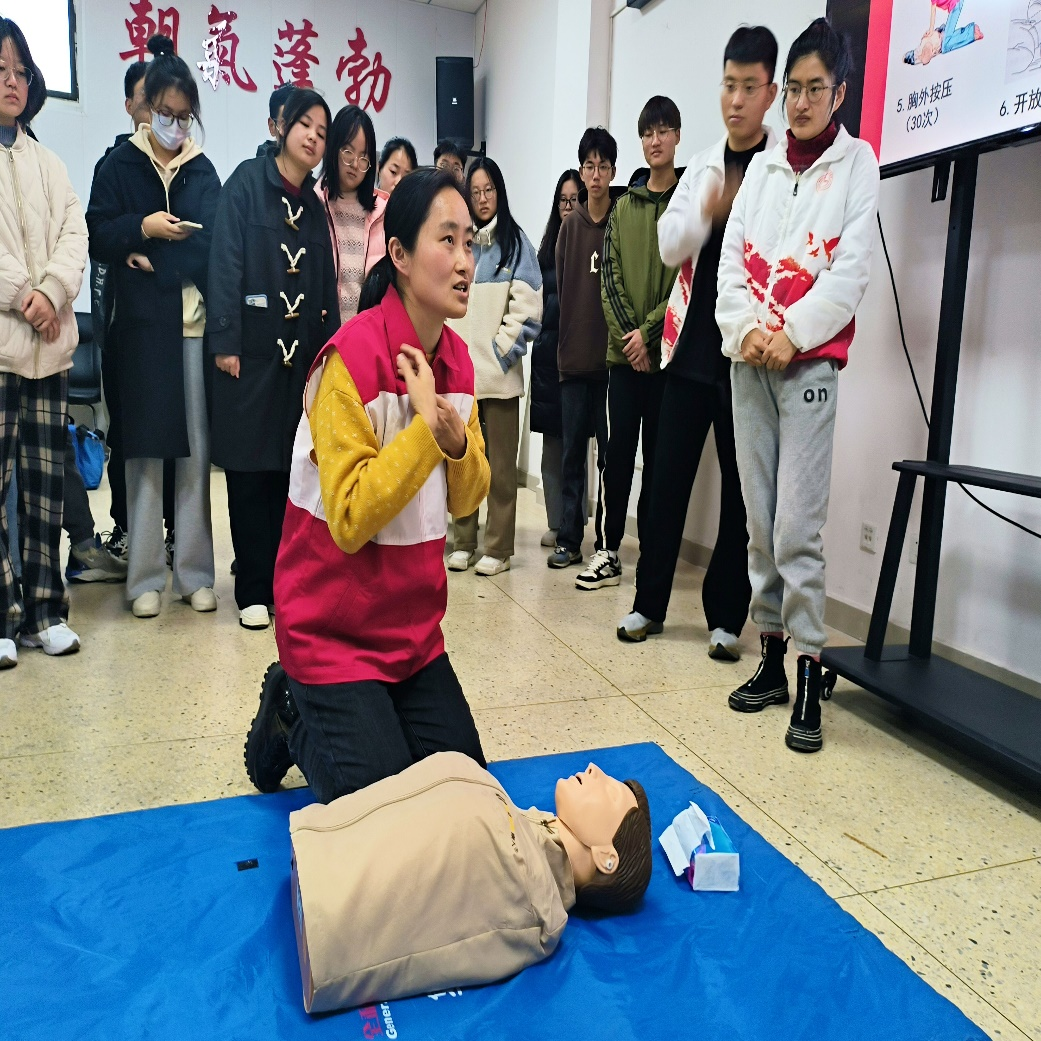 培训会上,两位老师围绕心肺复苏术(CPR)、创伤救护、意外伤害的救护等知识展开讲解,向同学们介绍了如何从意识、呼吸、脉搏判断救助者需要心肺复苏,现场进行了一场情景逼真的心肺复苏急救演练。整个培训过程采取讲解与演练相结合的方式,注重将救护知识、救护技能与日常生活实例相结合,让在场同学进一步了解应急救护基本知识,掌握心肺复苏急救和创伤包扎等急救技能。