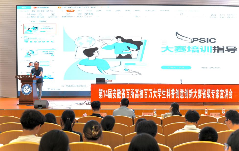 9月16日下午,为引导我校广大青年学生进行科学传播实践和科普作品创作,增强创新创业能力,鼓励和动员我校广大学生积极参赛,学校在舜耕会堂,举办第十四届安徽省百所高校百万大学生科普创意创新大赛宣讲培训会暨省赛动员会,邀请中国科学技术大学科技传播与科技政策系张燕翔副教授、安徽省科普产品工程研究中心事业二部总监叶浩,两位专家担任嘉宾进校进行两场专场报告,相关学院同学参加现场宣讲会。