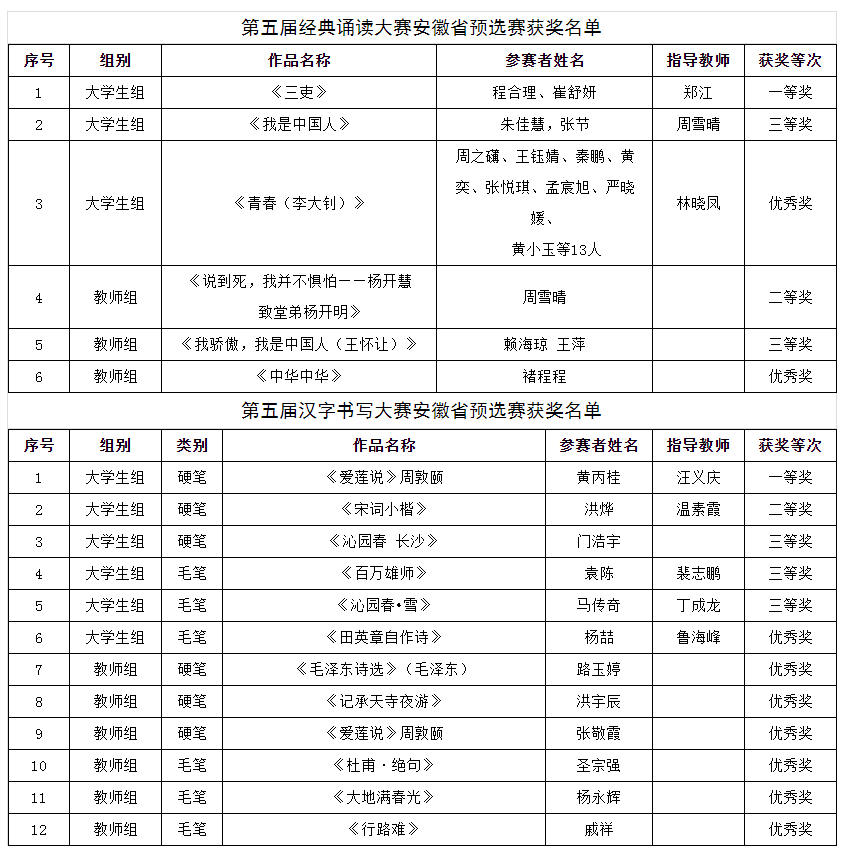 中华经典“诵写讲”系列比赛。6月16日,我校“第五届中华经典诵写讲大赛”校内选拔赛专家组相聚崇智楼,对100多件参赛作品进行专业评审,遴选出多组优秀作品参加省赛角逐。在第五届中华经典诵写讲大赛安徽省预选赛中,我校师生再创佳绩,荣获一等奖2项、二等奖2项、三等奖5项、优秀奖9项,郑江、汪义庆两位老师荣获指导教师奖,学校荣获优秀组织奖。
