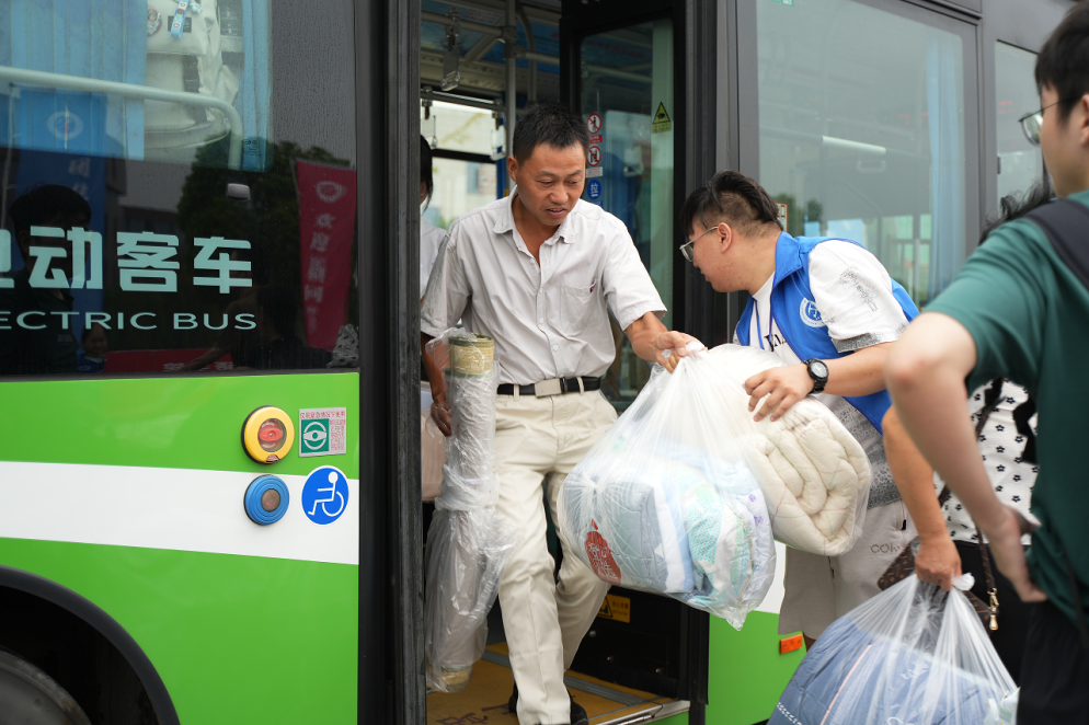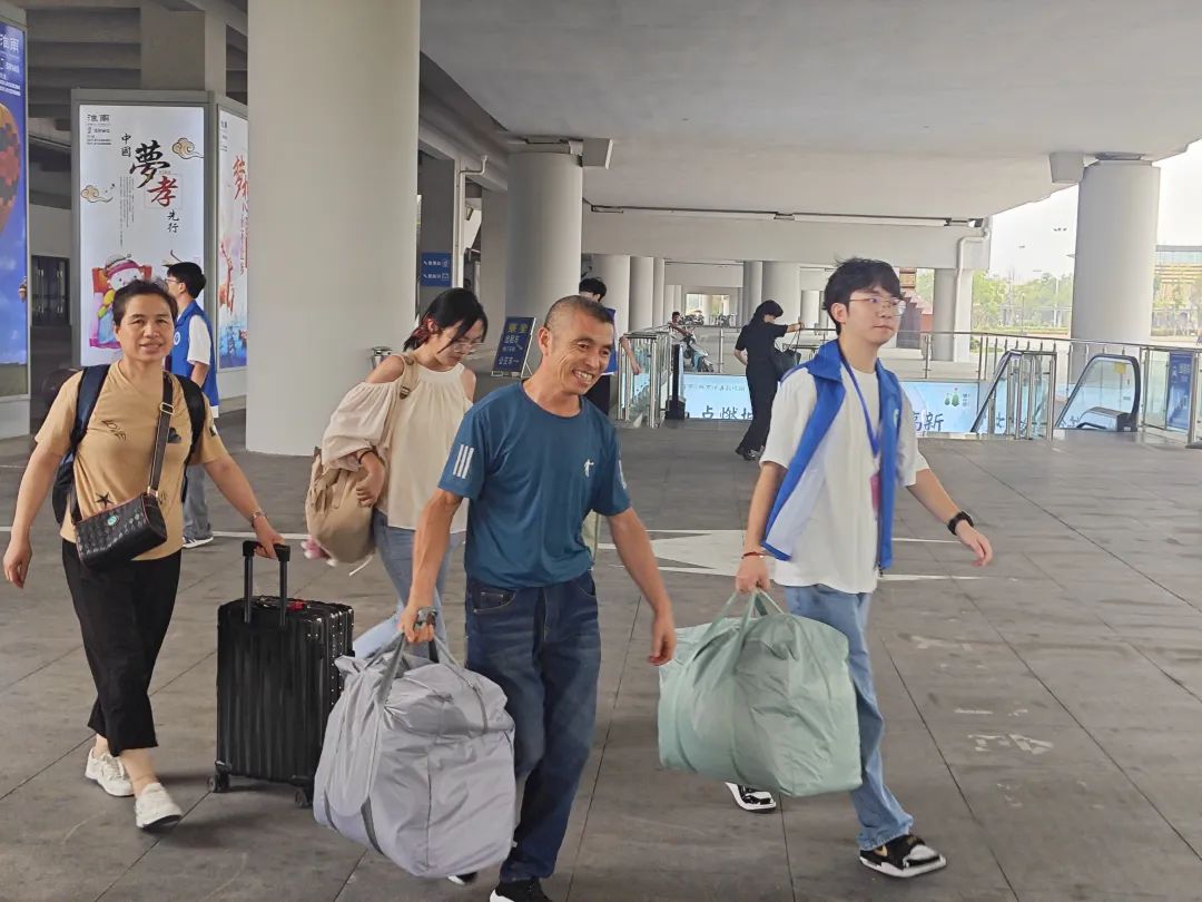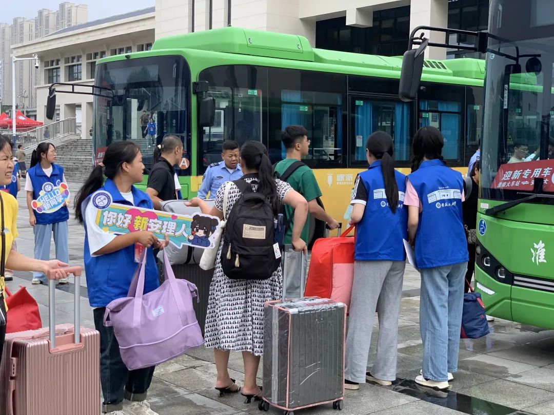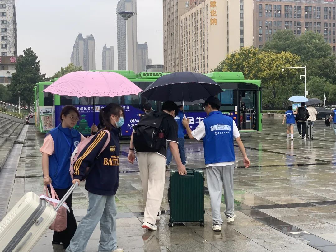 校内摆渡车接站点随着大巴车缓缓驶进,新生进入校园,“同学你好,我们来接你啦,欢迎成为新安理人”“叔叔阿姨好,可以在这边乘车,我们带您去报道点!”志愿者们身着蓝色志愿服,高举欢迎引导牌,以最灿烂的笑容,用最饱满的精神和最暖心的举动,帮助新生们报名注册、行李搬运,一路上为新生及家长答疑解惑,指引路线,每一步都安排得井井有条,确保每位新生都能快速适应新环境。冒着阵雨,志愿者们也是冲锋在前,给新生和家长搬运行李,撑起雨伞,让新生及其家长深切感受到来自安理志愿者的温暖与帮助。