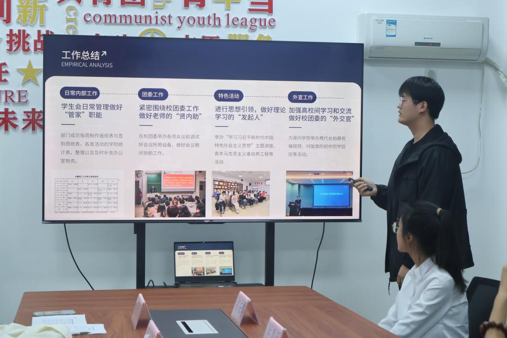 述职评议凝共识,同心聚力谋新篇。为持续深化我校学生会改革,进一步增强学生会工作人员服务能力、服务水平、服务意识,9月24日,校学生会在厚德馆A321召开2023-2024学年学生干部述职评议会。评议会组成成员包括校学生会指导老师胡时、学院学生会主席团成员代表、学生代表,评议对象为校学生会主席团成员和各部部长。