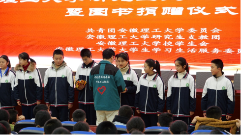 仪式的最后,城关中学的学生代表还收到了来自安徽理工大学学生亲手编织的400余份爱心围脖,学生们对这份突如其来的“温暖”惊喜连连。本次活动共捐赠图书2000余册,内容包括科普、少儿、文学、历史、地理等方面。