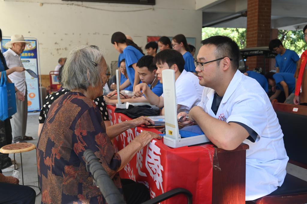 由医学院15名师生组成的“临床专家+大学生”健康关爱团队,在当地社区设置临时诊疗点,为居民提供健康咨询和公益体检服务。临床医生在了解群众的既往病史、症状表现基础上,提供个性化的治疗建议和健康指导;志愿者现场宣传预防脑卒中、结核病等健康知识,开展血压血糖检测、心肺听诊等10余项基础检查,并向居民免费发放爱心医药包。近200余名群众参与活动,刚接受完检查的刘奶奶称赞道:“孩子们不光给我看病,还教我怎么健康用药,真是又耐心又细致!”活动累计发放宣传手册300余份,爱心医药包200余份。