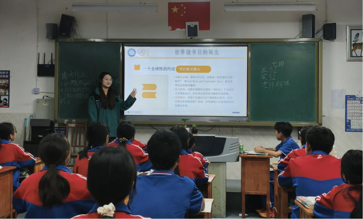 活动现场,支教团成员程齐佳以真挚动人的讲述,带领同学们走进书香满溢的阅读世界。她从世界读书日的由来展开,结合文学巨匠故事与经典传说,阐释阅读承载的文明与精神力量。她用“超级望远镜”“智慧大脑”“情感充电宝”“表达工具箱”四个生动比喻,诠释阅读在拓宽视野、锤炼思维、温润心灵、提升表达上的重要作用。同时,她细致讲解 SQ3R、批注法等高效阅读技巧,推荐经典好书,引导大家会读书、读好书、善读书。互动环节中,同学们踊跃分享读书心得,现场暖意融融、书香四溢。