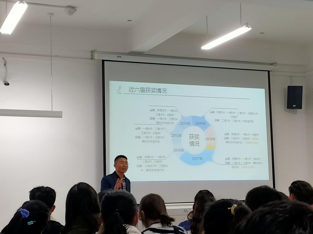 会上,唐克老师以基础教育重要性的视频短片为引入,详细介绍了“挑战杯”赛事的基本信息,阐述了“挑战杯”的创新性、先进性和实践性等特点,列举了学院、学校学生在往届“挑战杯”竞赛中取得的优异成绩。其次,他在鼓励同学们多研究社会热点、痛点问题的同时,对参赛流程、参赛注意事项、团队的组建、立意创新等进行了说明。最后,他为大家详细介绍了与学院专业较为相关的科技与发明制造类比赛项目,具体讲解了包括选题、团队、评分标准、比赛流程等相关事项,并与同学们分享了往届学生的参赛事迹,鼓励同学们积极参与今年的挑战杯大赛。