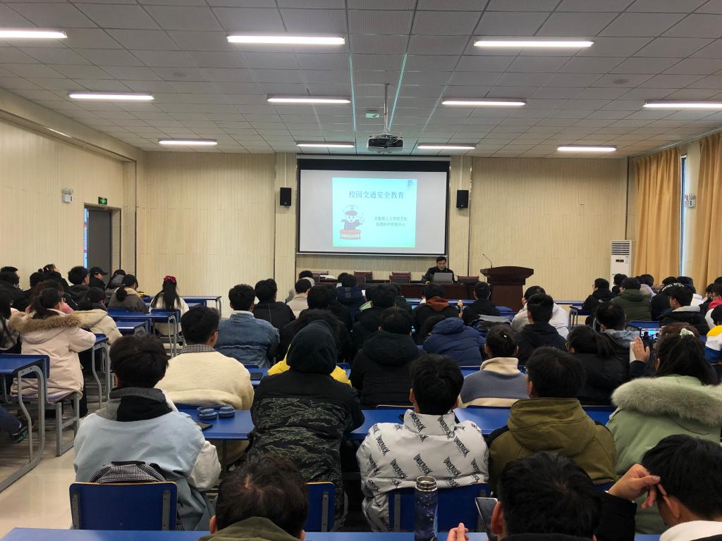 讲座现场,李虎紧紧围绕"校园交通安全教育"这一主题,针对日常生活中常见的交通违法行为如:行人惯性骑车横穿马路、不按信号灯通行、交通安全意识比较淡薄等情况,并结合校园重大交通事故案例,通俗易懂、生动精彩的讲解了道路交通中有关行人通行规定、机动车通行规定、非机动车通行规定和安全出行常识。