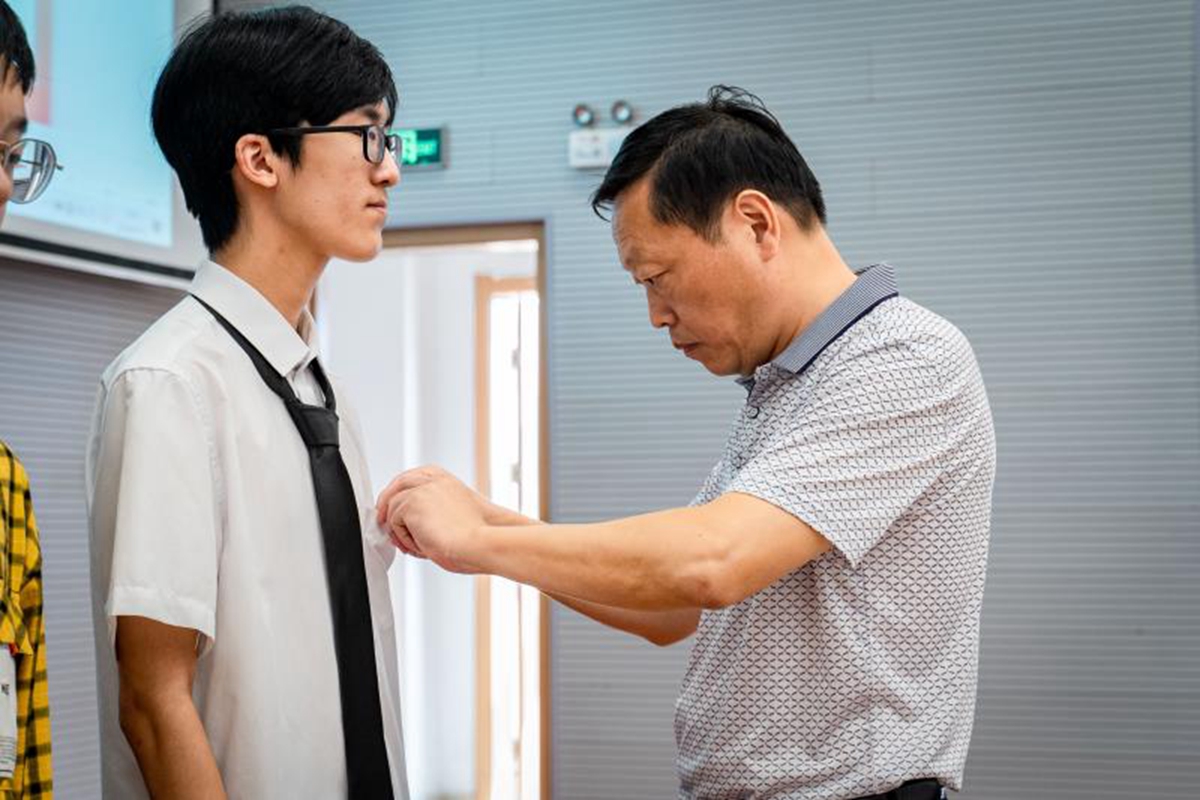 在校歌声中,学院党委书记王永祥、业务副院长葛斌为2020级新生代表佩戴了校徽,让新生感受到了加入安理这个大家庭的自豪感,也让新生入学教育更显仪式感。见面会仪式结束后,学院还组织202014个班级依次到行政楼前与学院领导、老师、2020级辅导员合影留念,共同记录新生的“小欢喜”。