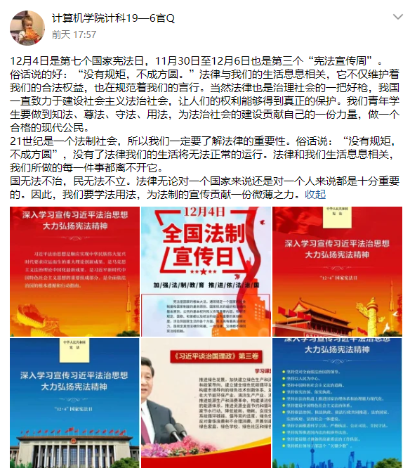 12月4日是第七个国家宪法日,11月30日至12月6日也是第三个“宪法宣传周”。为增强全院学生的宪法意识,弘扬宪法精神,12月4日至12月6日,计算机学院组织全体学生开展了一系列的宪法宣传学习活动。