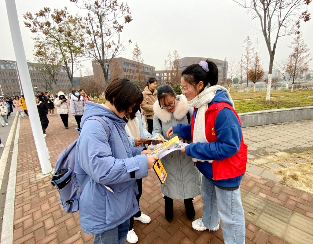 12月11日,学院e青春志愿服务队的志愿者们深入校园内的各主干道十字路口,与学校保卫处的老师一同引导校园车辆和行人有序通行,同时志愿者们分别在学校仁、爱、义、信四个区域派发交通安全知识宣传单,向来往的教师和学生详细讲解交通安全知识以及校园交通安全注意事项,分发宣传单共计200余份。