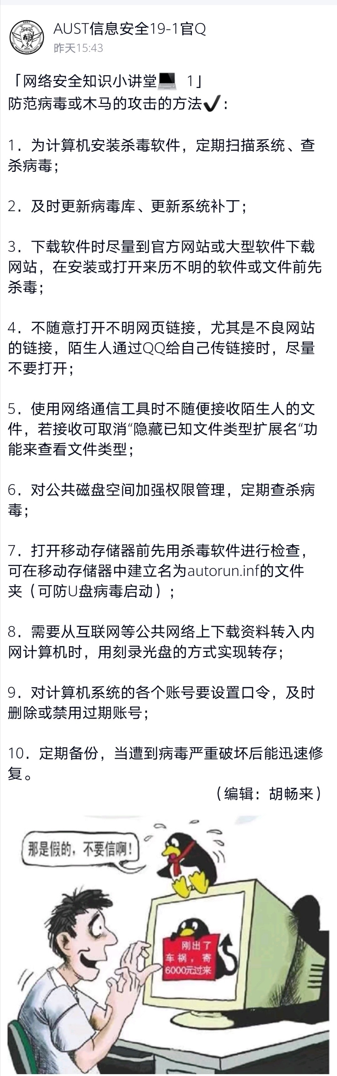 9月15日下午,计算机科学与技术2019-1班团支部制作网络防骗小贴士宣传页,积极分发给班级同学,向同学们讲解了个人信息隐私保护、网络诈骗犯罪、网络安全防范等方面知识,在班级范围内形成了学安全、懂安全、重安全的良好氛围。