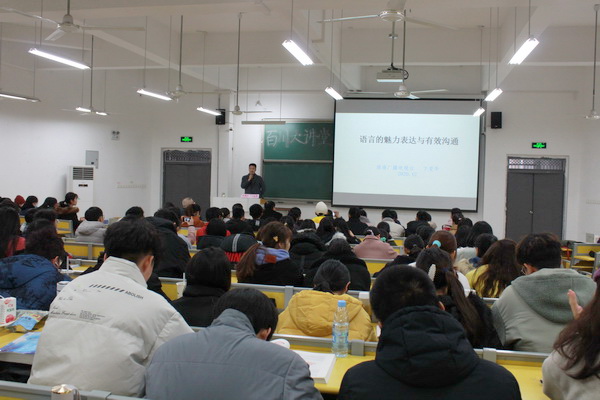 卞爱华从“语商”与“情商、智商”具有同样重要性讲起,介绍了语商的概念,怎样提升语商实现语言的魅力表达和有效沟通。他结合自己丰富的播音经验、富有魅力的语音和听众的现场实践训练介绍了发音的技巧。他现场与听众进行互动,点拨同学们的发音技巧,让语言具有“情、声、气”,从而在语言交流中获得自信、在求职面试中取得成功。还就上课的语言节奏、如何提问等与教师进行了交流。