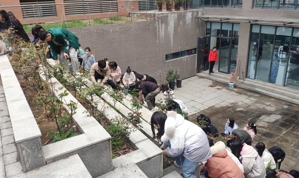 3月12日中午,学生党员们提着垃圾袋,拿着小铲子和水桶一一清理学校周边草坪上的纸屑、花坛里的树叶及绿化带内的垃圾,对绿植进行扶正、培土、修剪枝叶和浇水,用实际行动让更多人参与到保护环境行动中来,为营造绿色校园贡献自己的一份力量。