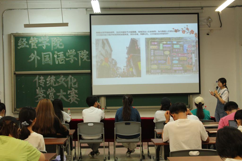本次比赛选手依次上台介绍传统文化,表达内容和形式多样。其中,营销20-2班刘宇鹏队讲述了自己家乡桐城的传统文化,并且通过六尺巷的故事展现了桐城人谦和礼让的精神;人力20-1班徐航从唱腔和表演的形式向我们展现了中国五大戏曲剧种之一的黄梅戏《女驸马》选段,引发现场热烈掌声;英语20-5班孔德辉队介绍了八大菜系的由来和各自的烹调技艺,展现了中华美食文化的巨大魅力。经过激烈的角逐,英语20-3班马鑫雅队荣获此次比赛的冠军。