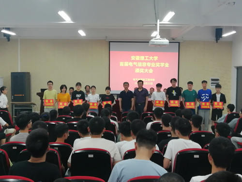 业务副院长欧阳名三宣读了表彰文件。根据《安徽理工大学“电气信息专业奖学金”评定实施办法(试行)》的规定,学院认真开展了评选工作,共有29名2017级本科生获奖,其中20名同学保送或考取了东北大学、南京航空航天大学、合肥工业大学、安徽理工大学等高校研究生。