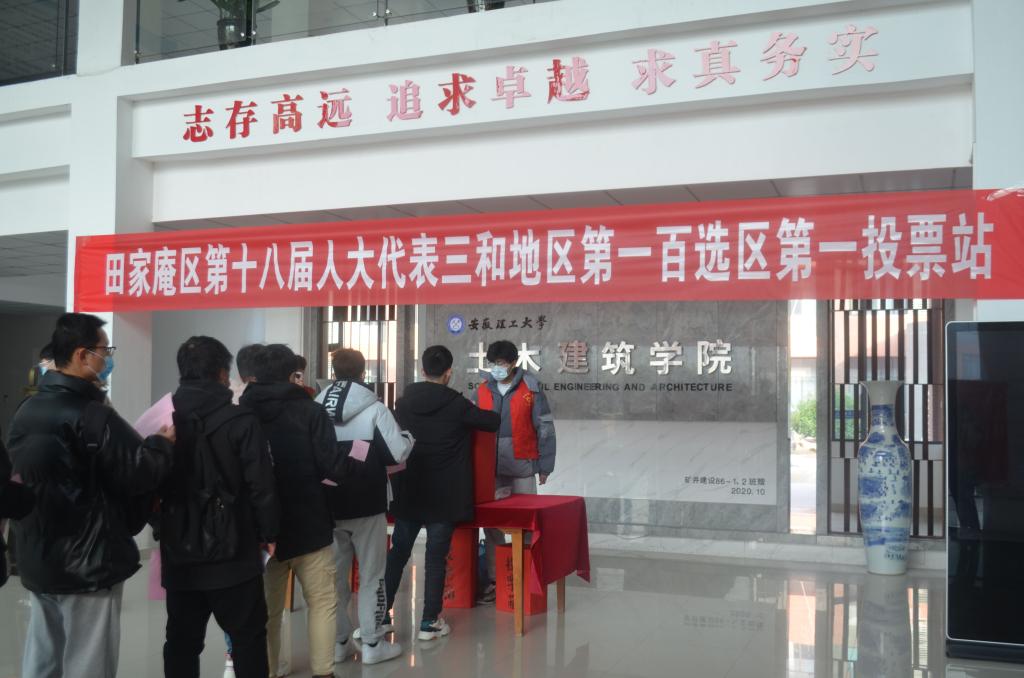 12月10日上午,土木建筑学院组织开展田家庵区第十八届人大代表选举工作。田家庵区第十八届人大代表三和地区第一百选区第一投票站设置在求是楼一楼大厅。全院3700余名选民现场有序投票。