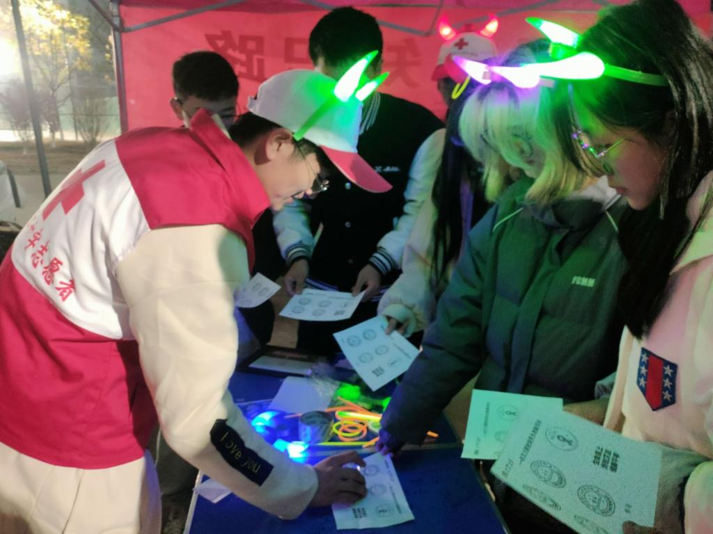 本次活动主题为“为爱奔跑,让‘艾’止步”,共设置5处集章点,每处均有防艾知识问答环节。晚上7点参加活动同学头戴荧光犄角、手拿荧光棒,从至诚操场出发,途径图书馆、厚德馆、信义操场、校医院一路奔跑,以实际行动为“艾”发声。夜跑队伍每到一处,都能把现场点亮,让学校显得更加璀璨。