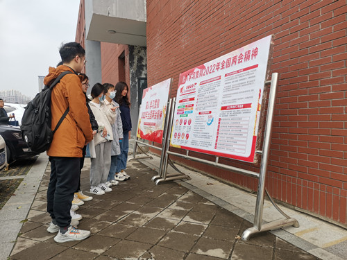制作宣传展板,普及两会内容。学院团委通过制作两会主题海报,宣传两会相关背景与核心内容,同时结合线上微信公众号相关推文,向广大师生传达两会精神,加大学习两会精神宣传力度。