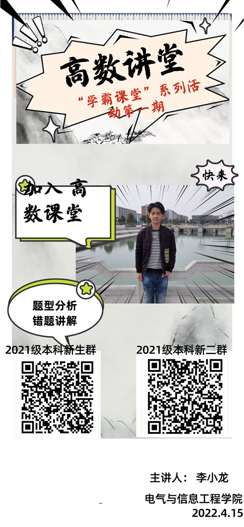 在学校封闭管理期间,为拓宽学生在线学习渠道、延伸学习阵地,进一步激发同学们的线上学习热情,营造良好的学习氛围,电气与信息工程学院于4月15日晚举办了“学霸课堂”系列活动第一期:高数讲堂。本次学霸课堂由2020-2021学年获得安徽理工大学数学明星奖(全校唯一)、电气学院的李小龙同学主讲,吸引近千名大一学子参加。