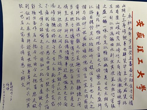 4月8日至9日,电信学院开展了“文书传情,笔墨同心”线上硬笔书法大赛,此次比赛以硬笔书写中华古诗词为内容,旨在弘扬传统、传承中华古诗词,坚定文化自信。比赛过程中,参赛选手满怀信心,神情专注,用心书写一笔一画。良好的书写习惯,字体结构匀称,横平竖直,整体美观。最终,自动化19-3班何伟等3位同学荣获一等奖,电子20-3班芮清如等5位同学荣获二等奖,电气21-8卢梦雪等7位同学荣获三等奖。