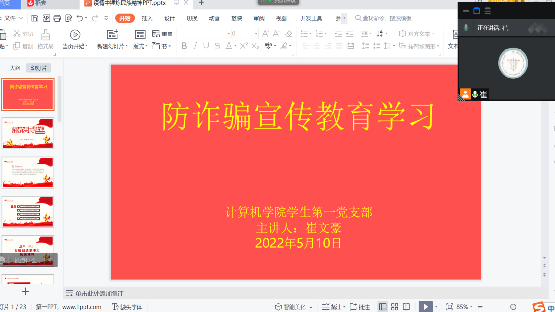 5月10日,学生第一党支部开展“防诈骗宣传教育学习”主题党课,对电信网络诈骗的套路进行详细介绍,结合校园内发生的具体案例,就如何预防电信网络诈骗,与同学们进行了探讨、学习,提醒学生擦亮双眼、力戒贪欲、防诈防骗,进一步强化了同学们的防范意识。