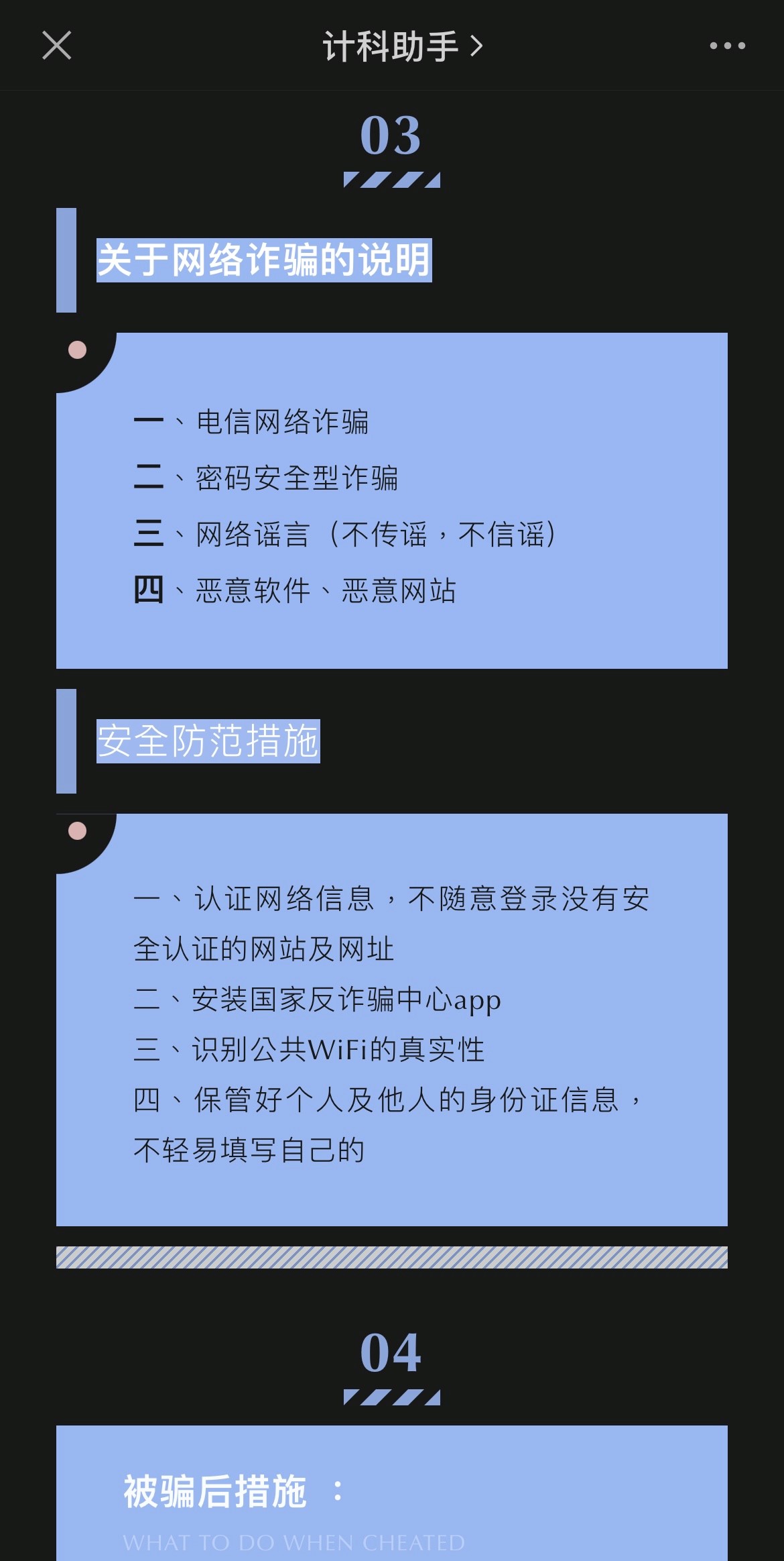 5月15日,学院发动各年级班级信息员深入宿舍开展防电信诈骗知识宣传,组织电信诈骗知识学习讨论,认真落实全体师生下载使用“国家反诈中心”APP,开启来电预警、短信预警等功能,做到学院师生安装率100%。利用学院计科助手、安理计算机等微信公众号推送防电信诈骗推文,切实增强师生防诈意识,全体师生共同努力,携手共建平安校园。