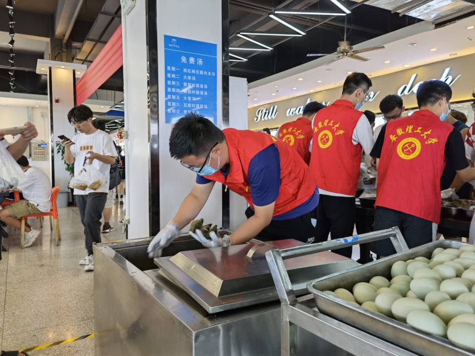 为提升毕业生党员的志愿服务意识和奉献精神,6月3-4日两天中午,力物学院学生党支部开展党员志愿者食堂帮扶活动。毕业生党员统一穿着志愿者红马甲,在义苑食堂就餐大厅参与服务工作。他们不畏炎热天气,在收残柜台收拾碗盘,清洁桌椅和地面等,并引导师生遵守食堂秩序,文明就餐。在就餐高峰期间,他们提醒师生间隔就坐,落实光盘行动,展现了“我为群众办实事”的党员风采。
