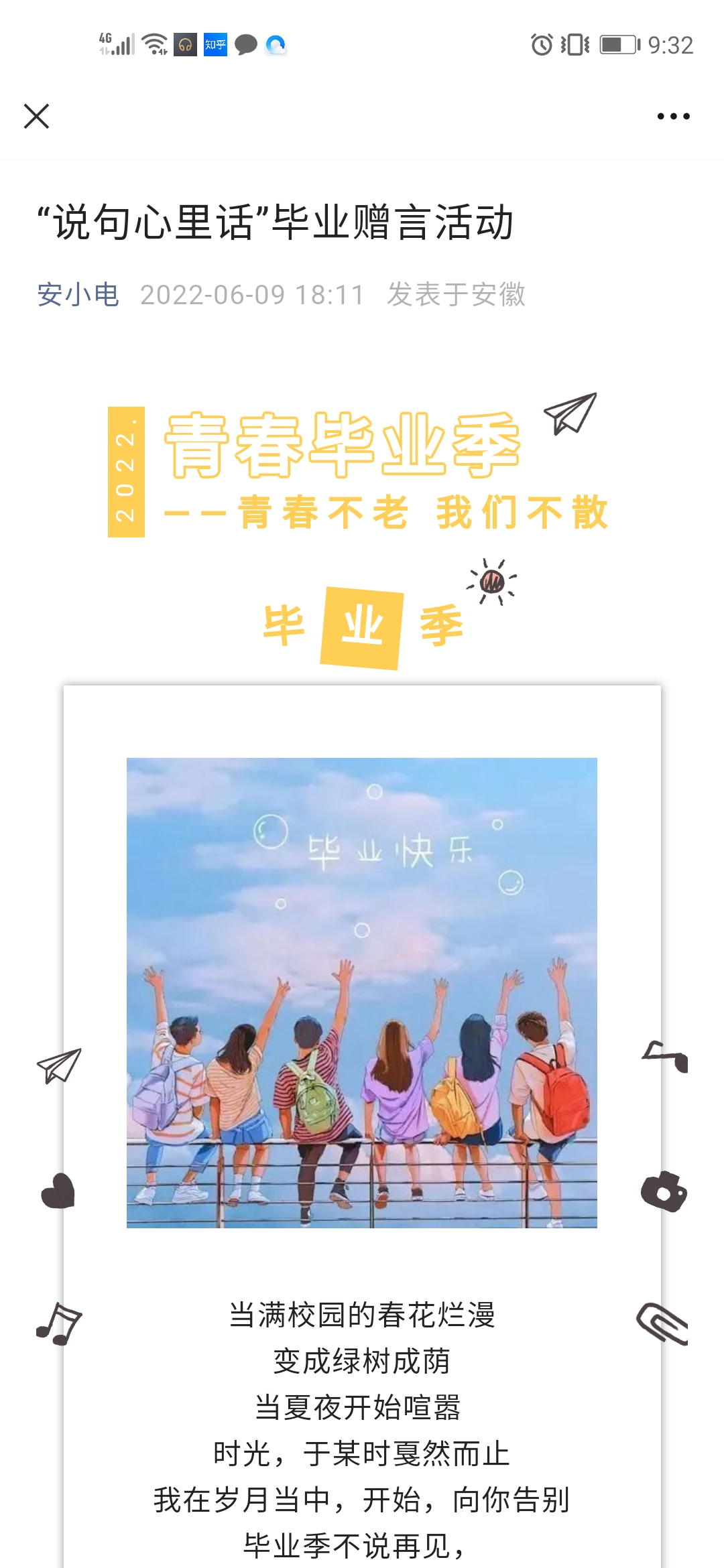 一句祝福赠母校。为引导毕业生增强母校情结、凝聚安理精神,毕业生们以文字、语音、视频等方式为母校送上祝福音信、留下毕业感言,诉说对别离的不舍,表达了毕业生对母校的感恩、对未来的憧憬和对梦想的向往。