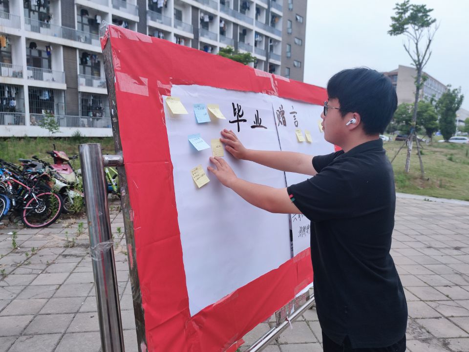 6月8下午,学院在义苑宿舍楼举办毕业赠言活动,毕业生井然有序地将自己的毕业赠言写在心愿纸上,祝福学校越来越好,祝福学院不断发展壮大,祝福老师们桃李满天下,祝福在同学们学业有成。在校生写下对毕业生的祝福语,祝愿毕业生们前程似锦。一张张带着回忆和祝福的心愿纸留在展板上,成为永恒的记忆,增进了毕业生和在校生的情感交流。