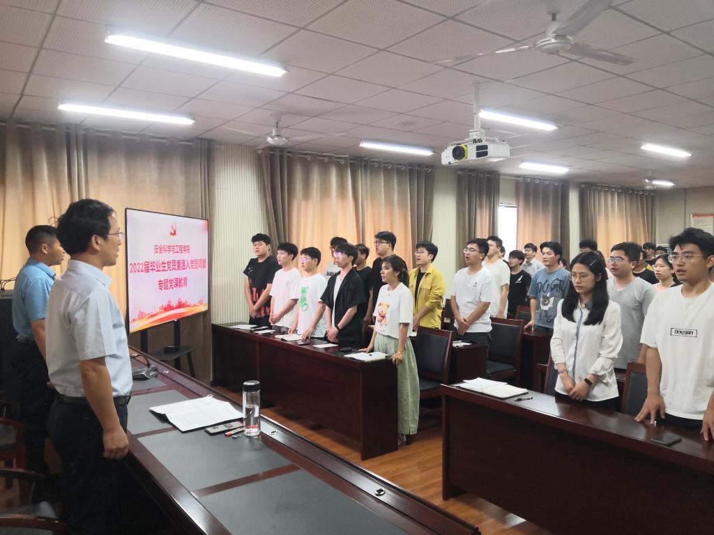 6月10日下午,安全学院在宁远楼A410报告厅举办2022届毕业生党员重温入党誓词暨专题党课教育活动。学院党委书记金德为毕业生党员上离校前“最后一次党课”。他勉励毕业生党员离校后继续传承和弘扬母校母院精神,以青春之我、奋斗之我为党旗增辉、为母校添彩。