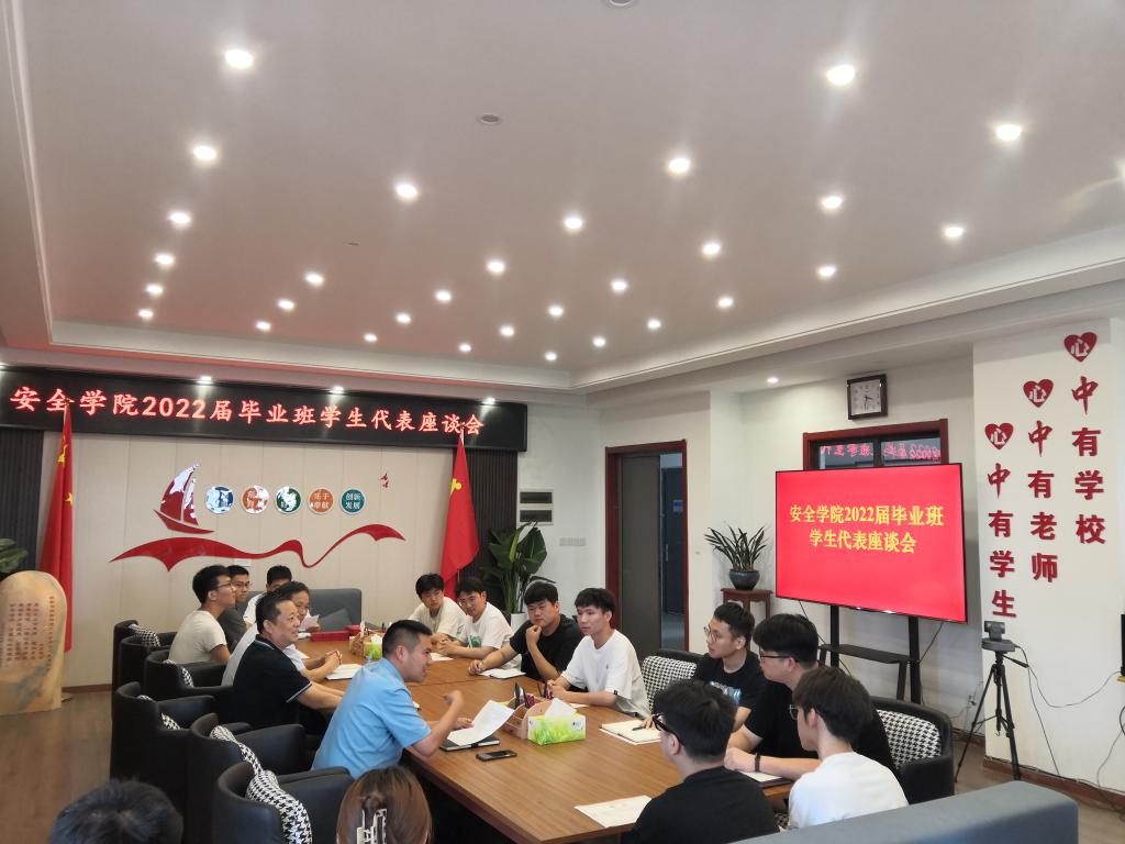 6月10日下午,安全学院在宁远楼A412举行2022届毕业生代表座谈会。毕业生代表积极发言,畅谈了在校期间的学习生活体会,介绍了自己的毕业去向,表达了对母校的感恩,向辛勤付出的老师们表示感谢,同时对学校和学院高质量的发展提出了建设性意见建议。院党委书记金德、院关工委常务副主任欧阳连勤对毕业生们顺利完成学业表示祝贺,并对毕业生代表们提出了殷殷嘱托,鼓励他们在筑梦青春、建功立业中不断增强志气、骨气、底气,争当艰苦奋斗、锐意创新的实干家,在青春赛道上跑出自己的最好成绩。