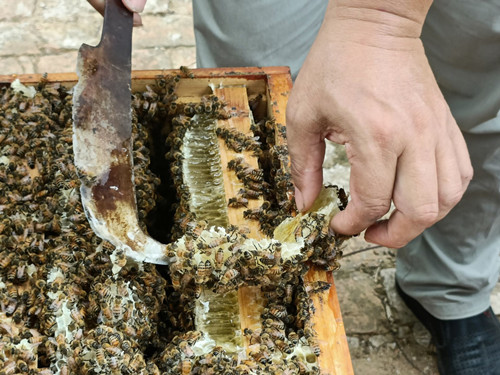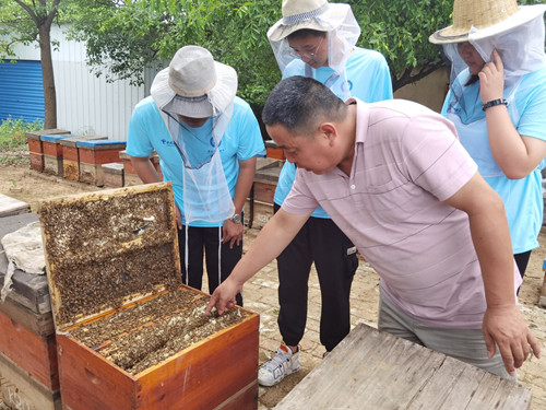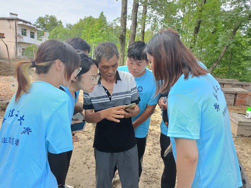 实践团成员们跃跃欲试,纷纷体验了近距离亲手接触蜜蜂的过程。在此期间,养蜂人跟队员们介绍了蜜蜂的养殖技术。首先是蜂箱的排列,一般有单箱分散排列和分组排列两种方法,前者就是利用地形进行单箱零散放养,避免在蜜源缺少时,发生盗蜂而互相斗杀;后者三至五群为一组,每组相隔2-3米远的地方,利用地形环境中的自然物作为明显标记,便于蜜蜂认巢,避免蜜蜂围巢斗杀。养蜂人还向队员们介绍了如何选育蜂王,从多年的养殖经验中可以知道哪个蜂群繁殖能力强、采集能力强,在数十箱蜜蜂的对比下,找到各项数据都优质的蜂群,用这样的蜂群来培育蜂王。