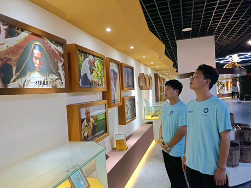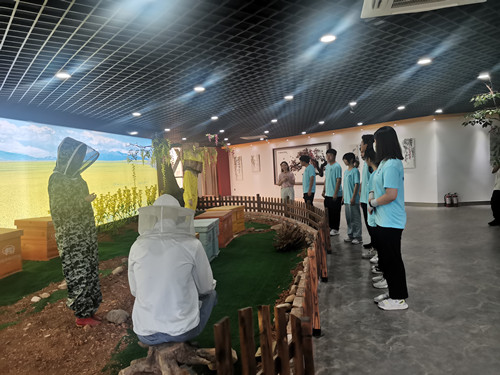 22日上午,实践团一行来到了安徽芜湖蜜蜂大观园。在大观园,实践团队员们紧随讲解员先后来到蜂产品展厅、蜜蜂文化科普馆,观看了蜜蜂3D电影。在第一层蜂产品展厅,展厅内摆放了各种琳琅满目的蜂产品,如蜂蜜、养生蜂醋、蜂花粉以及蜂胶等。在第二层蜜蜂文化科普馆,一条蜜蜂文化长廊展示了数千年养蜂历史所积淀成的绚丽多姿的蜜蜂文化,融艺术、文学、医药等领域。队员们不仅了解到蜜蜂社会的组成部分、蜜蜂宝宝的成长轨迹、蜜蜂是怎样工作的,以及养蜂人如何取蜜的等知识,还了解到蜜蜂文化,图文并茂讲解让实践队员们从蜜蜂身上受到很多启发。