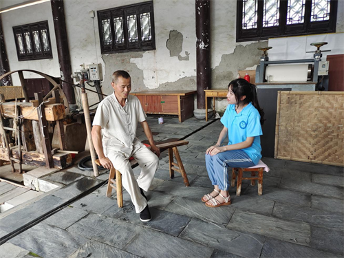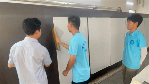 接下来实践团成员采访省非物质文化遗产传承人——红星造纸厂员工汪息发师傅,通过汪师傅的介绍大家了解到宣纸工艺中晒纸这一流程。汪师傅为大家做了示范:他轻轻地把薄薄的一层纸刮下来,再轻轻地把它转移到晾晒板上,用尺刷把宣纸铺平。不到10秒,一张薄如蝉翼的宣纸就贴在了加热的铁墙上。在汪师傅的指导下,实践团成员也参与到晒纸过程中。