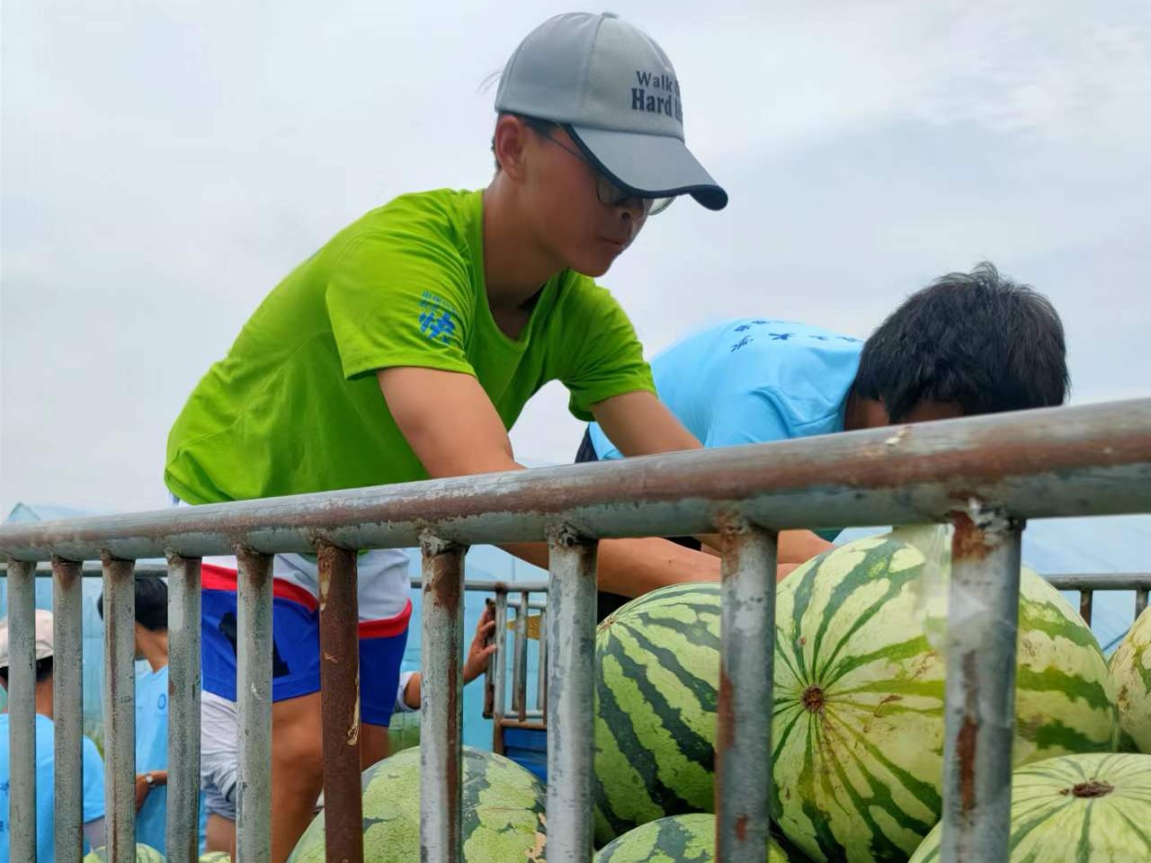 田间“大课堂”,劳动助农最光荣。恰是西瓜成熟的季节,在了解到当地集体经济作物西瓜成熟却缺少人力采摘的实际困难时,实践团当即决定走进西瓜基地与村委干部一起摘西瓜。虽然当天天气炎热,太阳当头,但是同学们不惧酷暑,顶着烈日,在工作人员的指导下摘瓜、运瓜、装瓜,这一步步在想象中看似简单的步骤,实际做起来却并不轻松,志愿者们在田间挥汗如雨,展现了志愿者们不怕吃苦的青年担当精神。