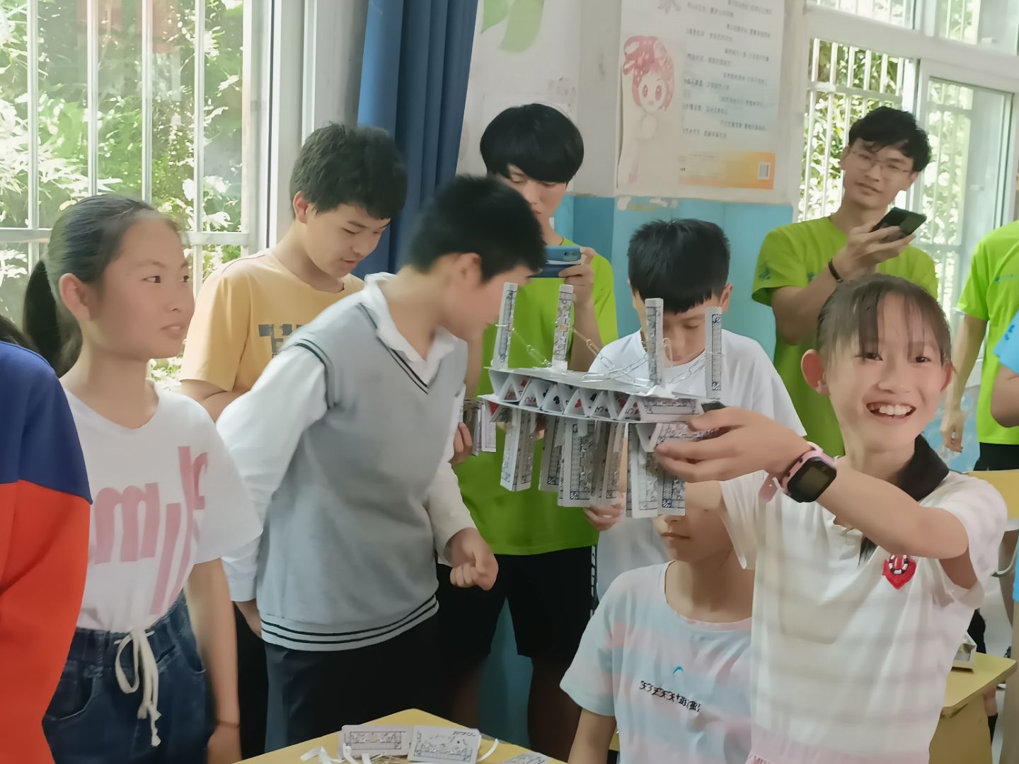 助力青春。从华丽的都市到发展中的小城,穿越河谷山林,驶进乡村小路,一路颠簸,团队到达活动第二站——渚口中心小学。在那里,志愿者和小朋友们进行“滴水成冰”科普小实验,增加他们对科学的兴趣;他们带领小朋友一起奇思妙想,开展纸牌搭桥活动,通过灵巧的双手将一张纸纸牌搭建起一座桥梁。在造桥过程,向小朋友讲解其中的力学原理,帮助他们更好地理解物理知识。