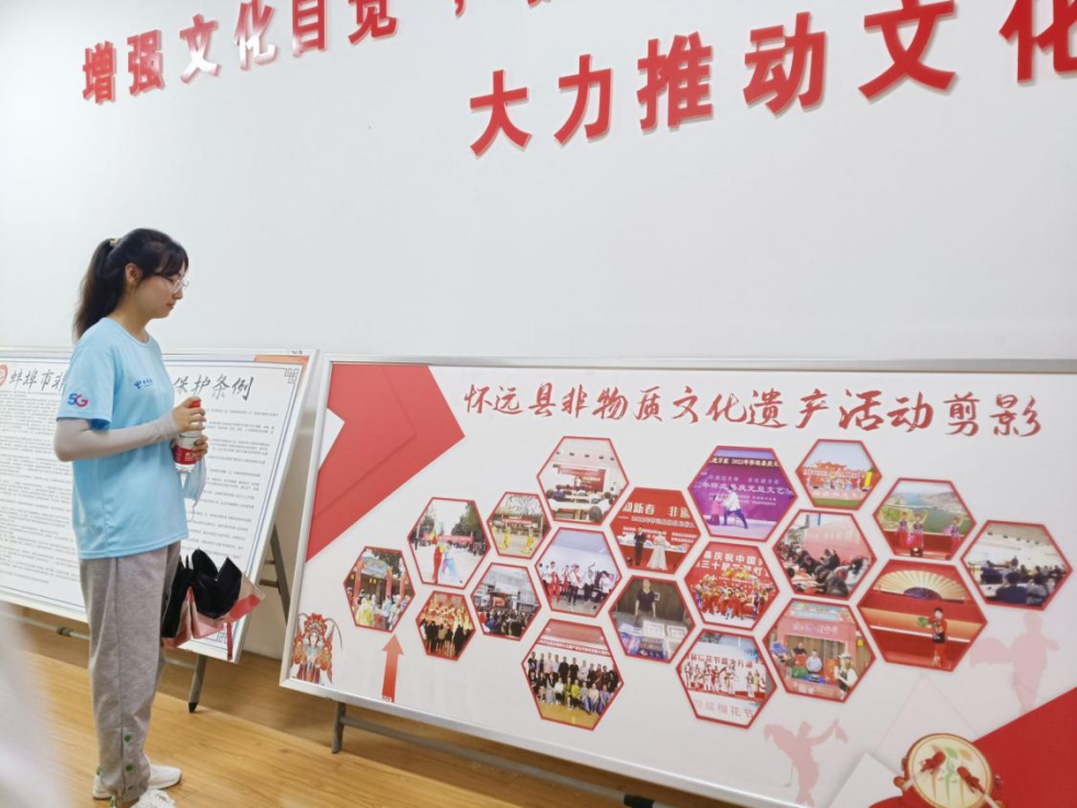 8月19日,实践团成员前往怀远县文化馆,与馆长张安娜热情交谈。张馆长向团队同学们介绍了蚌埠南路泗州戏在怀远县的发展现状、不足以及未来发展方向。随后,张馆长提及县文化和旅游局组织创作的泗州戏小戏《欠条》,该戏围绕怀远石榴文化,以决胜小康社会、决战脱贫攻坚为背景,彰显了怀远县广大人民群众像石榴籽一样紧紧抱在一起,不畏困难,脱贫致富,共同发展的团结精神,对提升品牌知名度和影响力,推动石榴业综合发展起到良好的宣传作用,带头实现了传统文化与经济发展的结合。团队成员在张馆长的带领和介绍下,通过一张张怀远县非物质文化遗产剪影了解怀远县文化与经济的结合发展的实例。