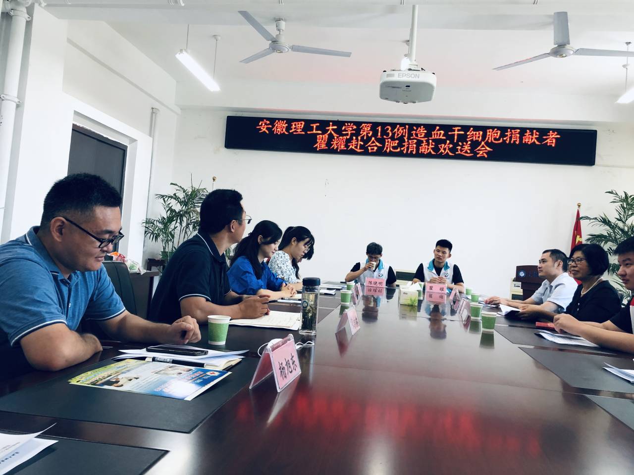 9月5日上午,淮南市红十字会联合安徽理工大学在求是楼南231会议室举行造血干细胞捐献者瞿耀同学赴合肥捐献欢送仪式。淮南市红十字会常务副会长兼秘书长陈玉琴、校团委副书记丁玲玲、土木建筑学院党委副书记张向林、教师代表、淮南市造血干细胞已捐献者代表及志愿者代表、国寿财险公司负责人出席欢送仪式。