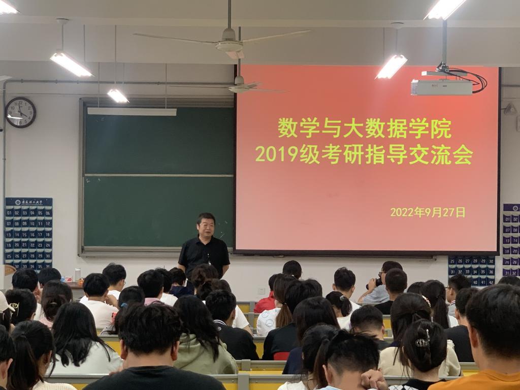 9月27日下午,数学与大数据学院于明理南316教室召开2023届毕业生考研动员会暨交流指导会,学院院长赵前进、副书记马蓓蕾、许峰教授、方欢教授做考研动员与指导,会议采取线上线下相结合的方式,共180余名学生参加会议,会议由院长赵前进主持。