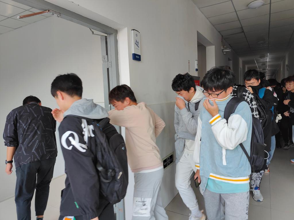 随着演练现场模拟烟雾的蔓延及警报声的骤响,演练正式开始。辅导员、学生干部及宿管老师迅速到位组织学生开始疏散。同学们在辅导员老师的指挥下,弯腰猫步并用手帕、毛巾等捂住口鼻,按照疏散路线紧张有序撤离到宿舍楼外的安全地带。