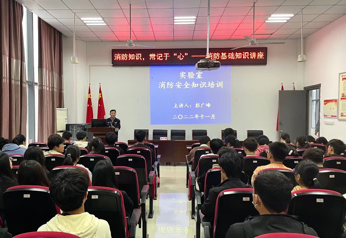 消防宣传常态化,基础知识应知会。11月11日,学院邀请校保卫处彭广峰老师在崇义楼B118会议室举办消防基础知识培训讲座,实验室老师、2022级新生及辅导员参加培训。彭广峰强调了实验室防火安全的重要性,并结合消防安全事故案例视频开展警示教育,详细讲解了消防设施、器材的性能、用途及操作中的注意事项等知识。