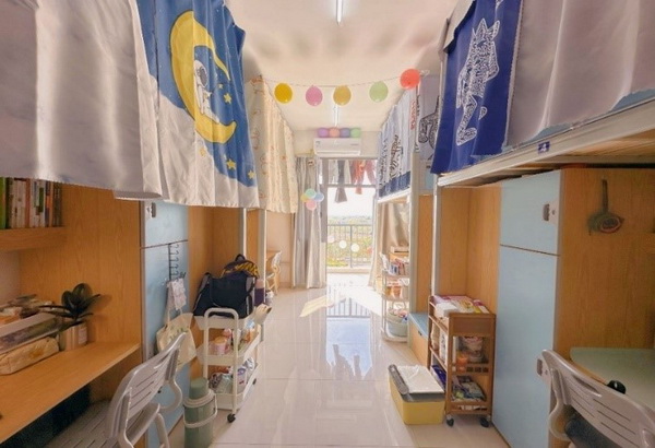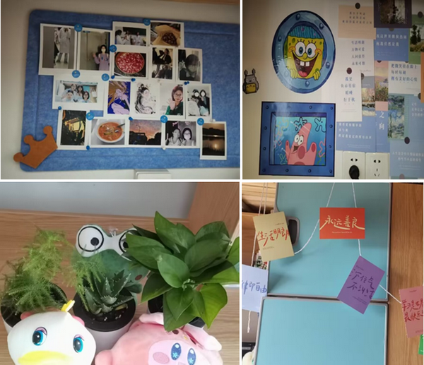 踏入宿舍,看到的是整齐的被子、干净的地板以及温馨的装饰。参赛者们依次向评委们阐述了各自宿舍的装扮构思和创意亮点。各个宿舍的风格不一,信苑C3E313室以“比奇堡”为主题,寝室里用充满氛围感满满的云彩灯进行装饰,柜子上都贴满了海绵宝宝系列的卡通人物,用来代表她们不同的性格和特点。信苑D327宿舍将室友们从入学相识到相知生活瞬间的照片打印下来贴在墙壁上,表现出她们喜爱用照片记录生活的态度,把平凡的生活变得弥足珍贵。除了温馨舒适的生活环境,各寝室还制定了包含秩序管理、作息时间、卫生值日和注意事项的宿舍公约,为积极健康的生活状态提供保障。