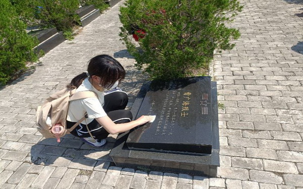 初进烈士陵园,同学们都被陵园中庄严肃穆的气氛所感染,油然而生一种敬仰之情。园内烈士纪念碑高23米,雄伟而神圣,同学们怀着崇敬的心情向着纪念碑默哀,并自发在烈士墓碑前进行了清扫,以这种方式来追悼和缅怀先烈。“英雄可以无名,但不可以被遗忘”,每一位烈士的墓碑背后都是一段可歌可泣的悲壮故事。最后,实践队成员们庄重地对着烈士墓碑三鞠躬,表达了对烈士崇高的敬意,也同样在心灵上受到极大地震撼。