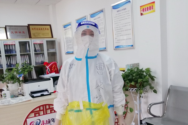 社区的管理非常人性化,对于行动不方便的人们,就采取上门采样的方式检测。这项工作,曹冬黎老师参与了两次就深深体会到医务工作者的不易。她所在小区是新老结合的小区,有很是多没有电梯的多层楼房。穿着厚厚的防护服,有时需要爬5楼或6楼,几个采样下来,她们都累的气喘吁吁,汗流浃背。因为穿脱防护服不方便,她们早上起来都不敢喝水,这样就能坚持一上午不去洗手间。所以,想想在传染病院、在方舱工作的医务工作者们,她说这点辛苦又算什么呢。