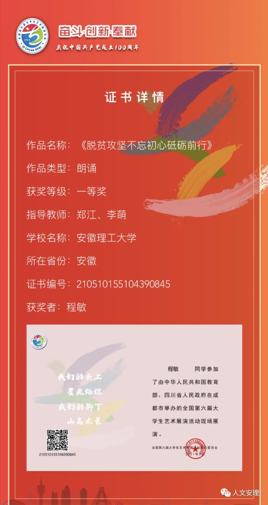 第六届全国大学生艺术展演活动全国一等奖