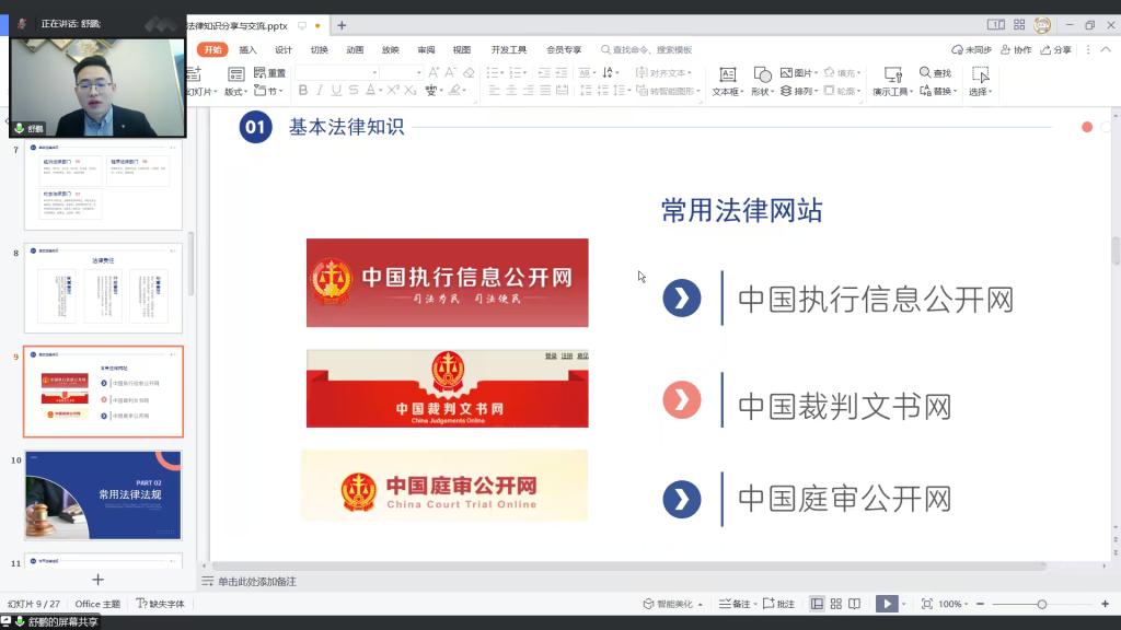 为了增强学生的法制观念,提高学生的法律意识。12月11日下午,材料科学与工程学院特邀学院2019届优秀校友,江苏诚鑫律师事务所执业律师舒鹏开展法律知识专题讲座,学院团委书记储兆晶主持讲座,辅导员和各年级200余名学生线上聆听讲座。