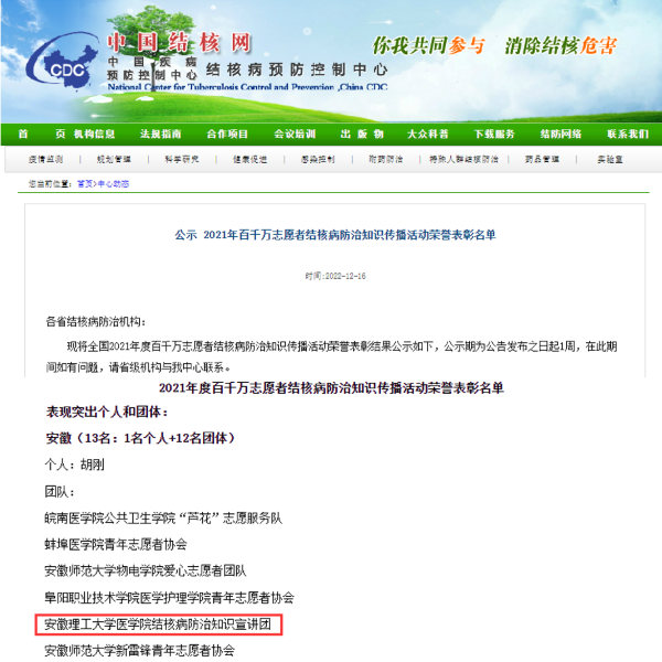 近日,中国疾病预防控制中心发布《2021年百千万志愿者结核病防治知识传播活动荣誉表彰名单》,我校医学院结核病防治知识宣讲团获得2021年度优秀团体荣誉称号。